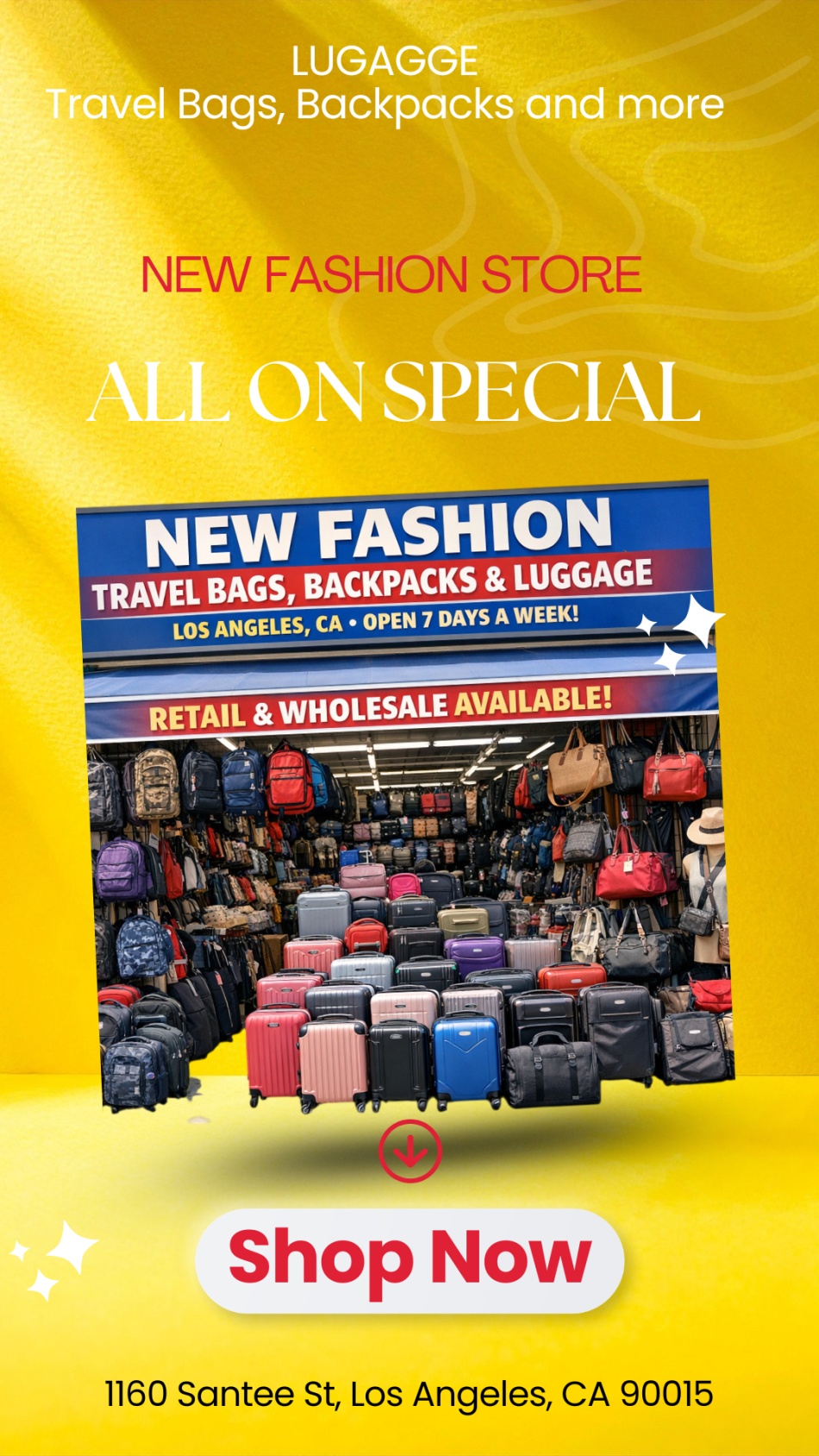 Visit us at 1160 Santee St, Los Angeles, CA, where we offer a wide selection of high-quality travel products. Our store specializes in a variety of items including travel bags, backpacks, strollers, leather bags, and accessories.